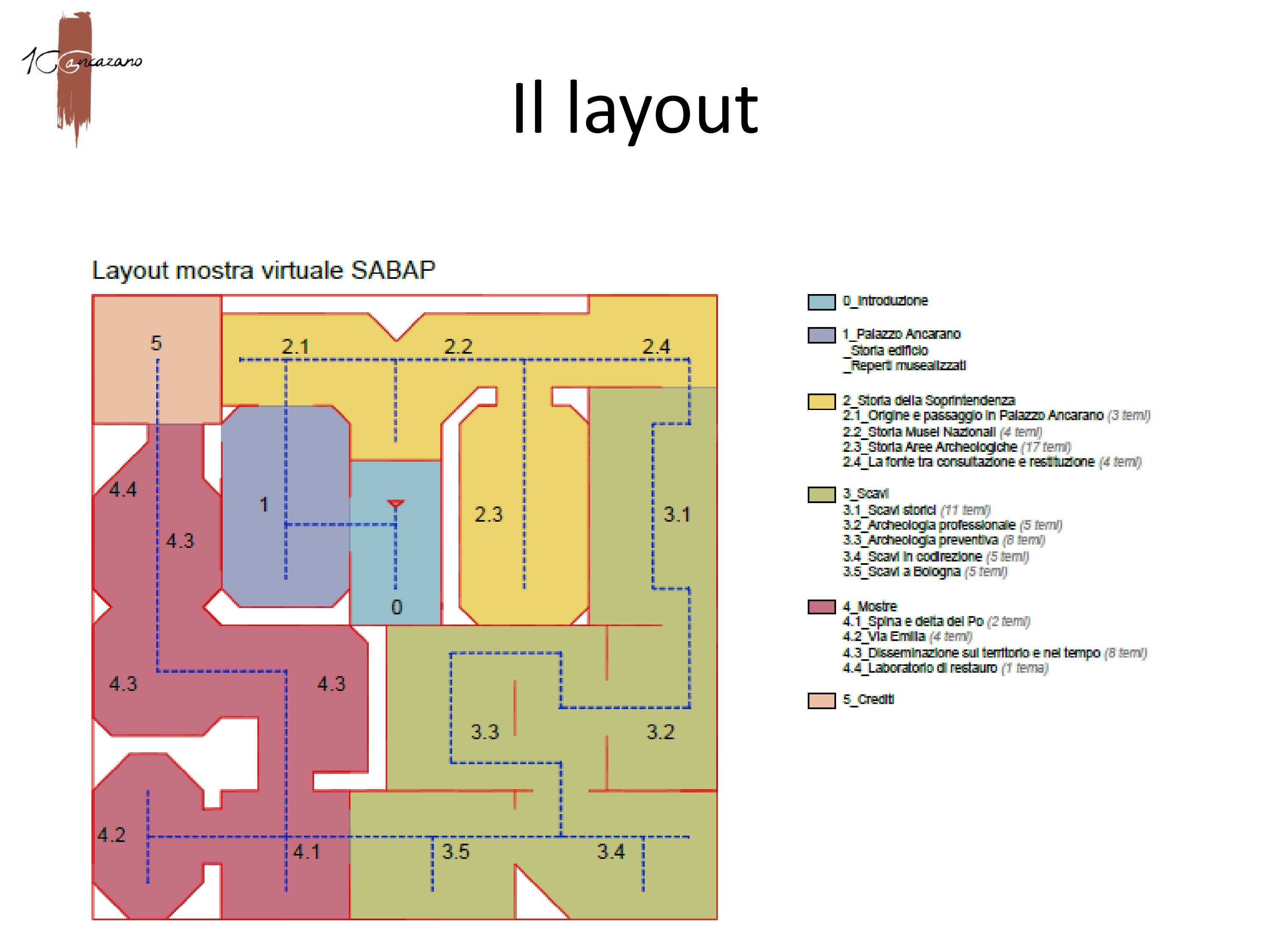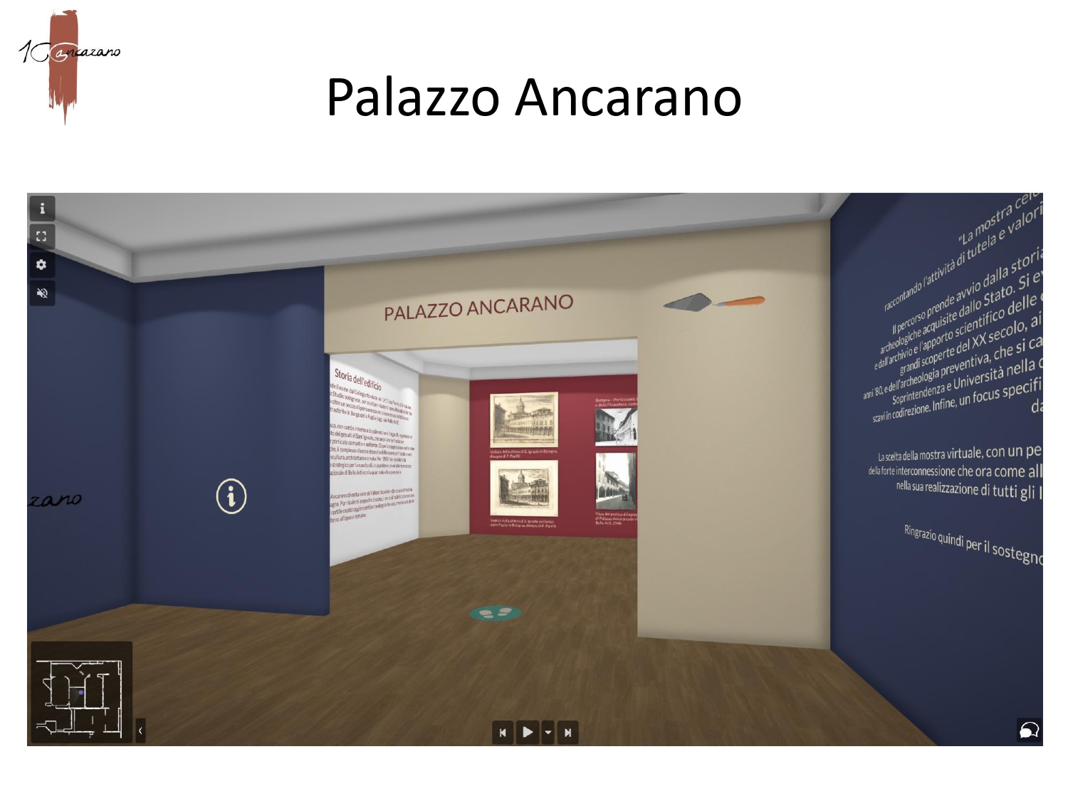Dopo un'introduzione a cura del Direttore Generale ABAP Fabrizio Magani e della Soprintendente ABAP per la città metropolitana di Bologna Francesca Tomba, il percorso prende avvio con la prima sezione dedicata alla storia di Palazzo Ancarano -che deve il nome al Collegio fondato nel XV secolo da Pietro d’Ancarano, giurista e docente dello Studio bolognese, per ospitare studenti non abbienti di diritto civile e canonico- e ai numerosi reperti musealizzati all'interno dell'edifico e provenienti da ricerche effettuate nel territorio agli inizi del '900 e alla fine degli anni '90, che testimoniano la storia di Bologna dall'età del ferro all'epoca romana.