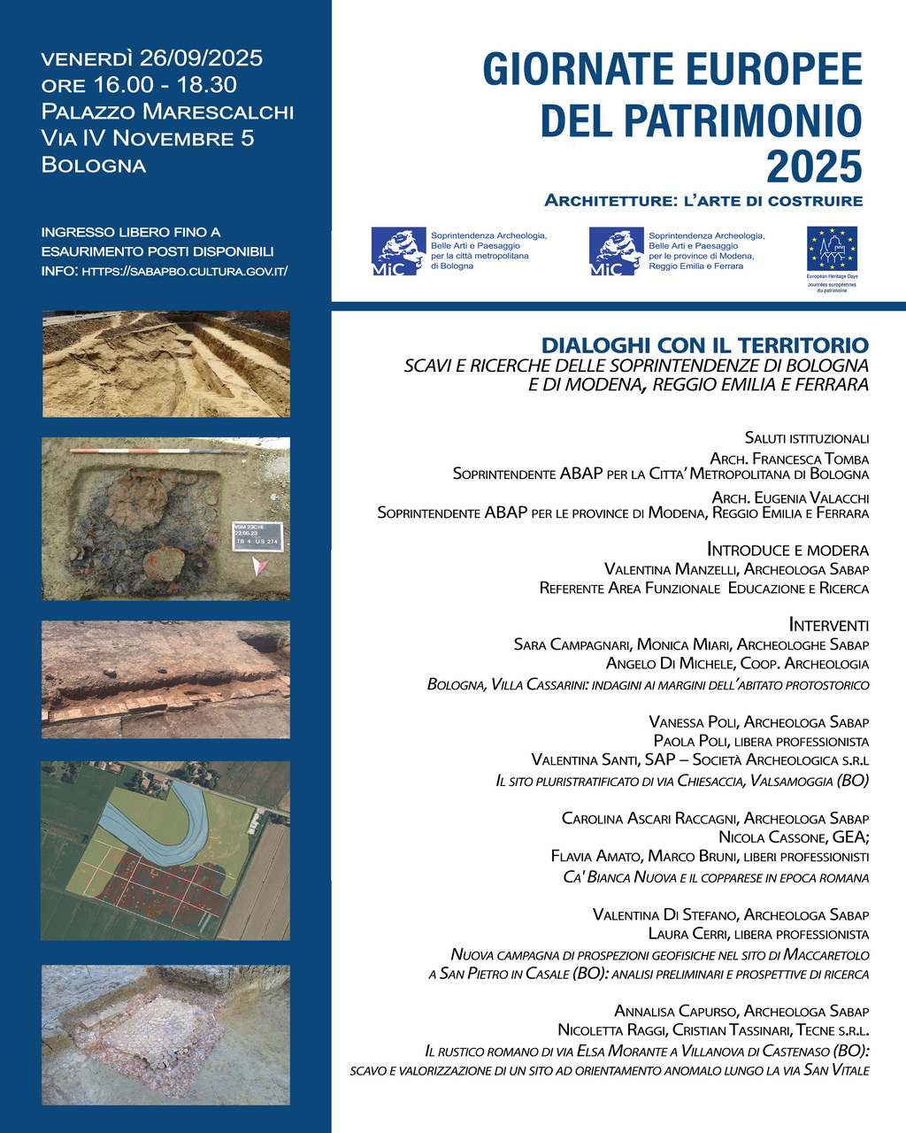 Nell'ambito delle Giornate Europee del Patrimonio 2025 la Soprintendenza Archeologia Belle Arti e Paesaggio per la città metropolitana di Bologna e la Soprintendenza Archeologia Belle Arti e Paesaggio per le provincie di Modena, Reggio Emilia e Ferrara organizzano un incontro con i Funzionari archeologi referenti per il territorio e con professionisti e studiosi esterni, nel quale verranno presentati i risultati dei più recenti interventi di scavo e ricerca condotti sulle province di competenza.
