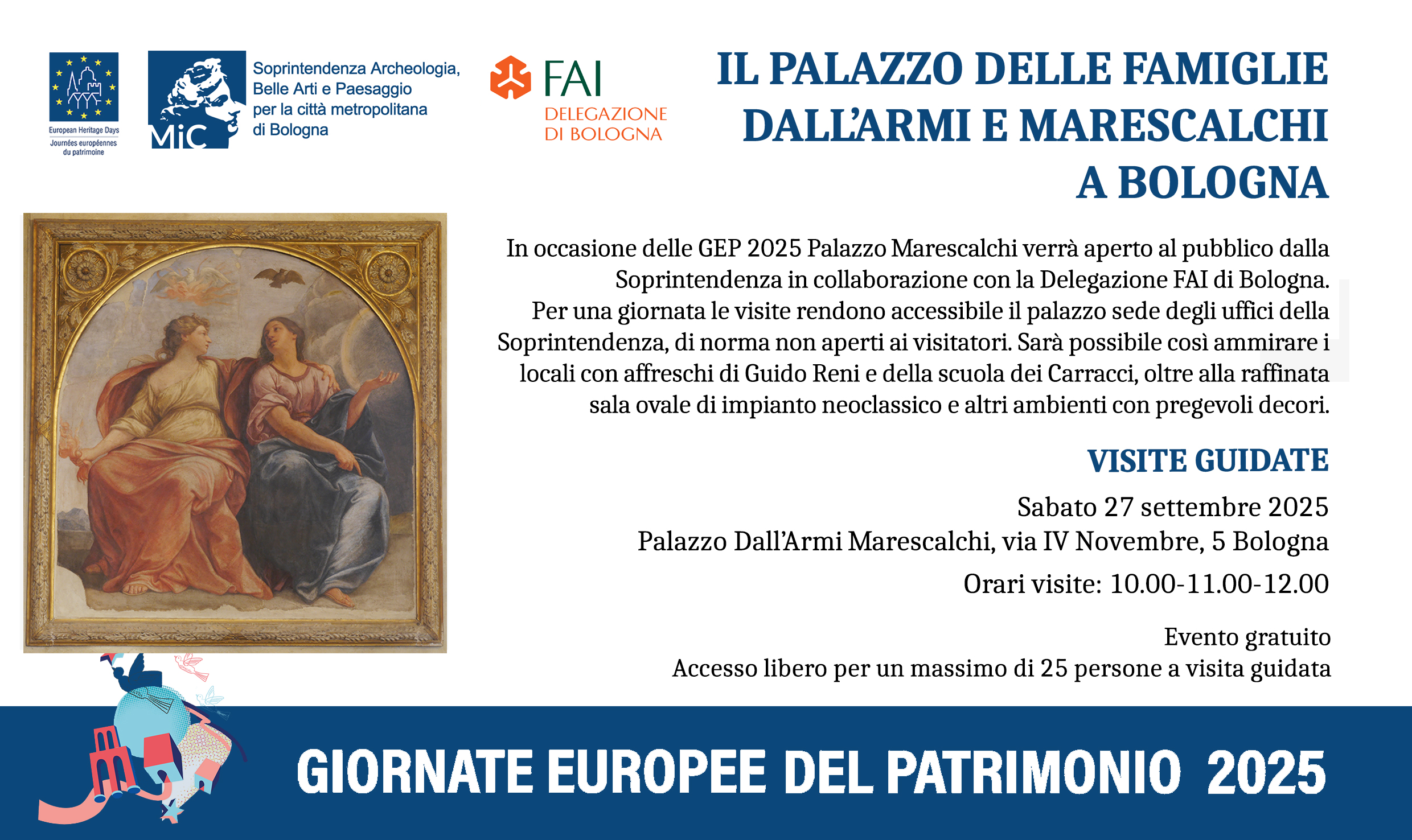 In occasione delle Giornate Europee del Patrimonio 2025, Palazzo Marescalchi verrà aperto al pubblico in collaborazione con la Delegazione FAI di Bologna. Per una giornata le visite rendono accessibile il palazzo sede degli uffici della Soprintendenza, di norma non aperti ai visitatori. Sarà così possibile ammirare i locali con affreschi di Guido Reni e della scuola dei Carracci, oltre alla raffinata sala ovale di impianto neoclassico ed altri ambienti con pregevoli decori.