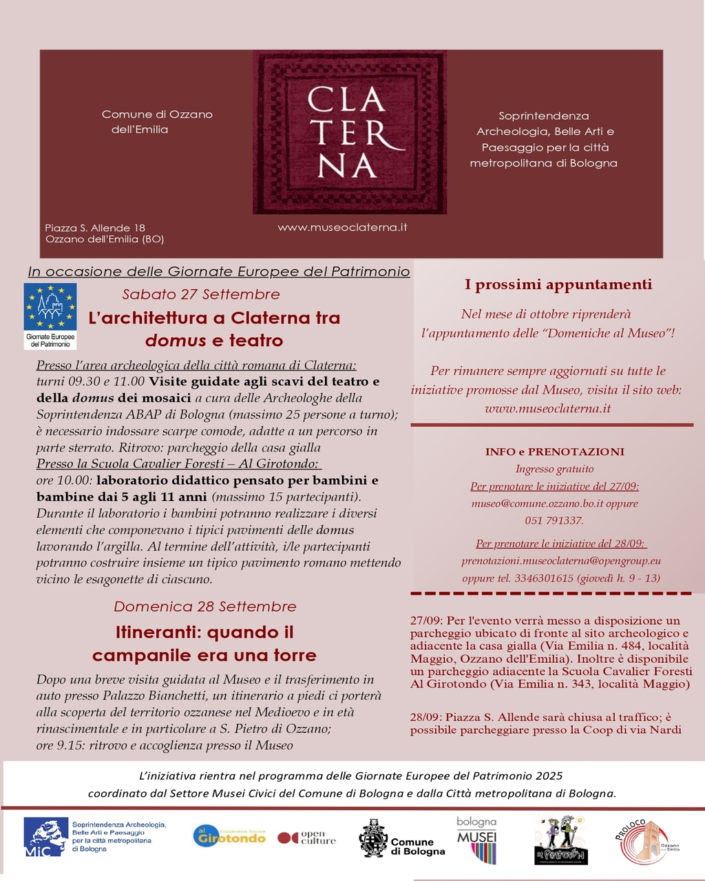 In occasione delle Giornate Europee del Patrimonio 2025, la Soprintendenza Archeologia, Belle Arti e Paesaggio per la città metropolitana di Bologna propone le seguenti iniziative: