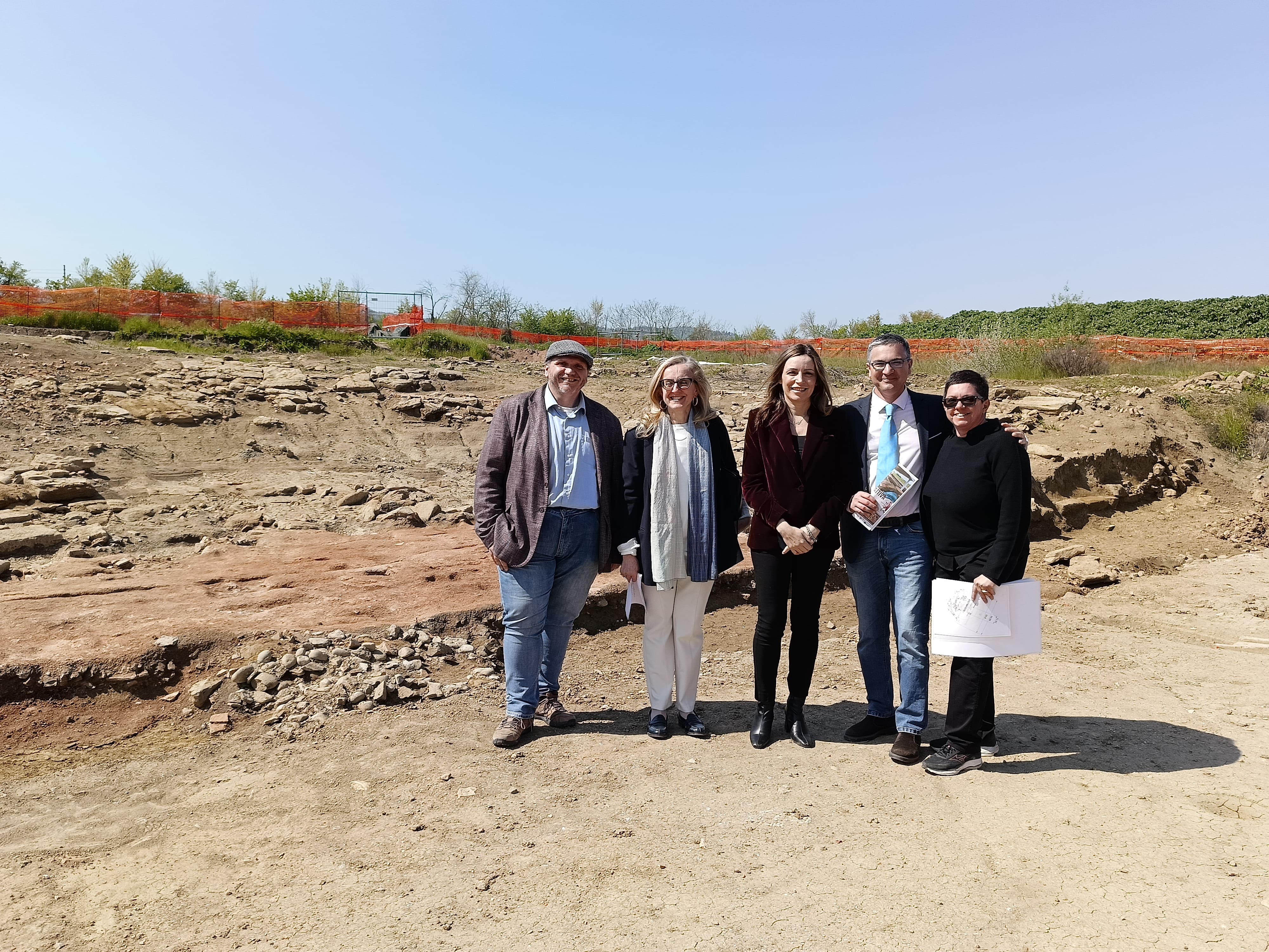 Visita allo scavo, da sinistra: Luca Lelli, Francesca Tomba, Lucia Borgonzoni, Matteo di Oto, Valentina Di Stefano