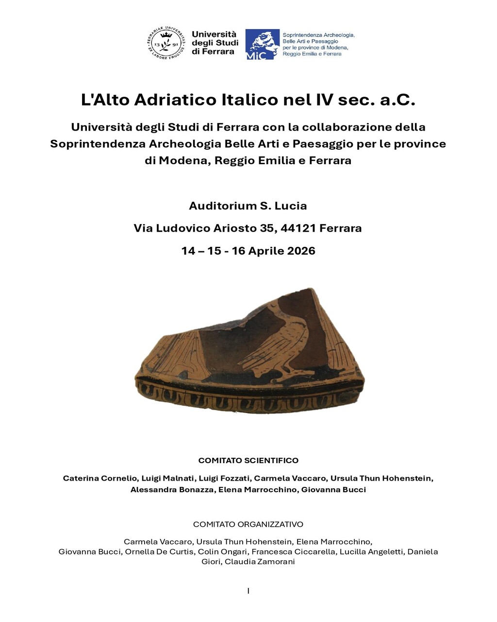 L'Università degli Studi di Ferrara, con la collaborazione della Soprintendenza Archeologia Belle Arti e Paesaggio per le province di Modena, Reggio Emilia e Ferrara, organizza un convegno di approfondimento dedicato ad Archeologia, Storia e Ambiente dell'Alto Adriatico Italico del IV sec. a.C.