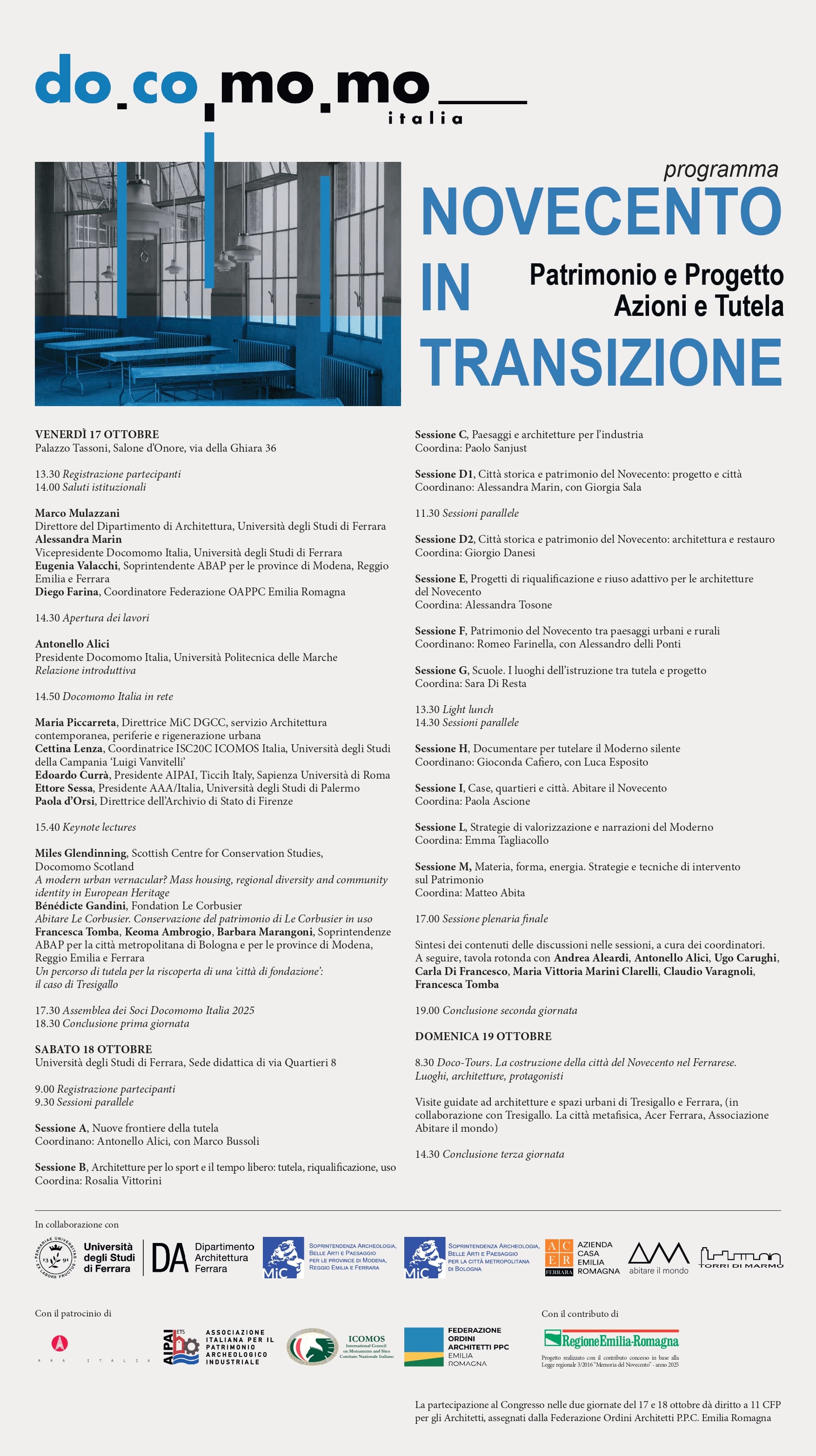 Si segnala il Congresso NOVECENTO IN TRANSIZIONE: Patrimonio e Progetto, Azioni e Tutela che si svolgerà il 17, 18 e 19 Ottobre 2025 a Ferrara, organizzato da Docomomo Italia in collaborazione con l’Università degli Studi di Ferrara, la Soprintendenza Archeologia, Belle Arti e Paesaggio per la città metropolitana di Bologna e la Soprintendenza Archeologia, Belle Arti e Paesaggio per le province di Modena, Reggio Emilia e Ferrara.
