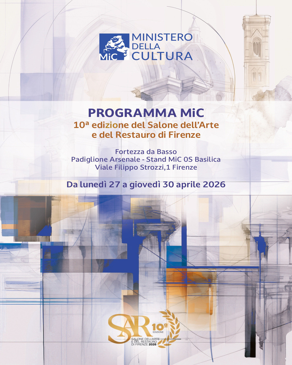 Dal 27 al 30 aprile 2026, la Fortezza da Basso di Firenze ospiterà la X edizione del Salone dell'Arte e del Restauro di Firenze, un evento a cura di Dipartimento per la Tutela del Patrimonio Culturale (DIT) e Direzione generale Archeologia, belle arti e paesaggio (DG ABAP).