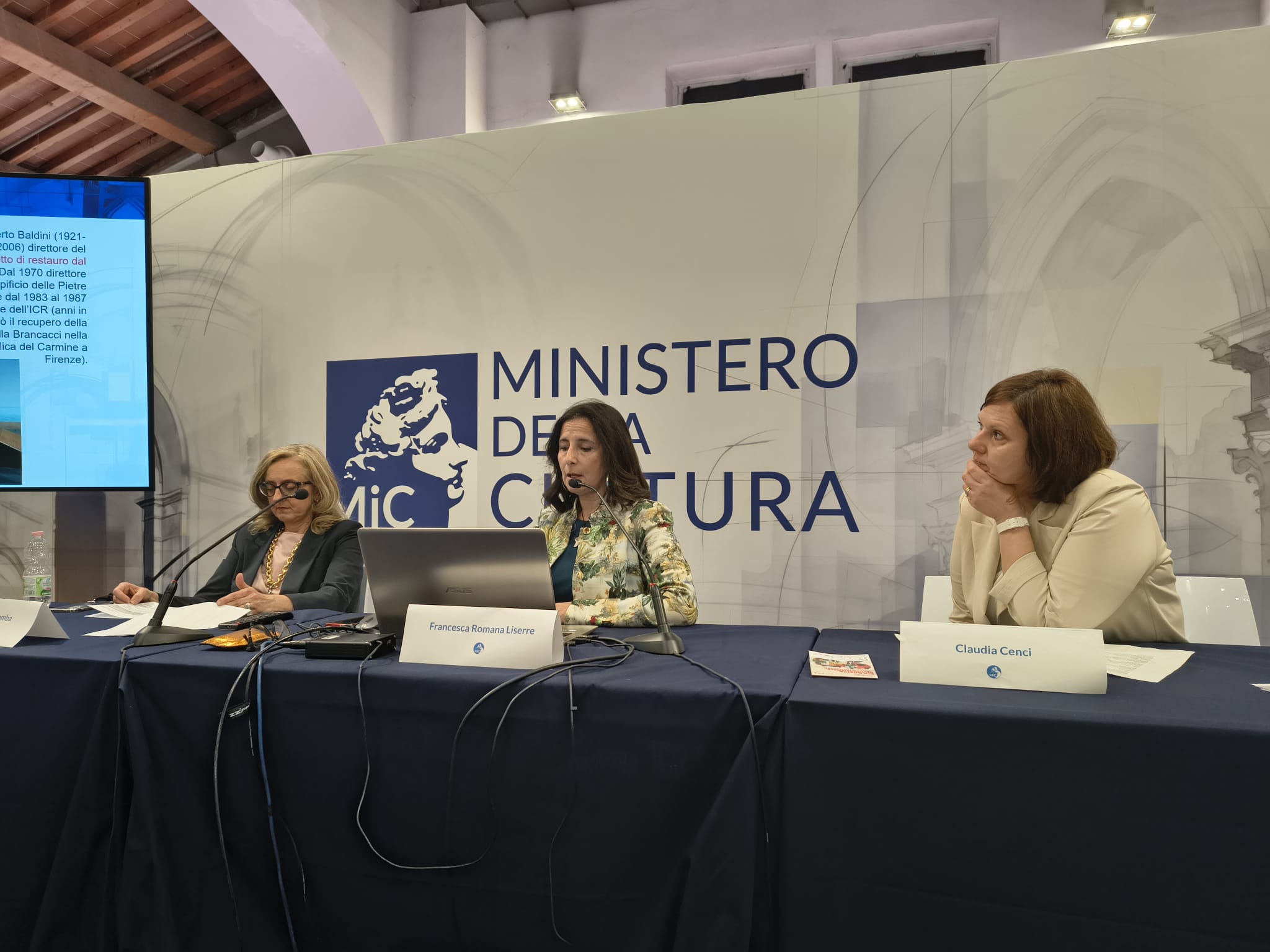 Alcuni momenti del convegno. Da sinistra: Davide Indelicato, Funzionario architetto SABAP RA; Claudia Cenci, Direttore ICRI; Francesca Tomba, Soprintendente SABAP-MET-BO; Francesca Romana Liserre, Funzionario architetto ICR