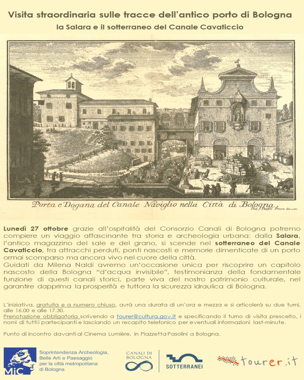 Lunedì 27 ottobre, grazie all’ospitalità del Consorzio Canali di Bologna, potremo compiere un viaggio affascinante tra storia e archeologia urbana: dalla Salara, l’antico magazzino del sale e del grano, scenderemo nel sotterraneo del Canale Cavaticcio, tra attracchi perduti, ponti nascosti e memorie dimenticate di un porto ormai scomparso ma ancora vivo nel cuore della città.