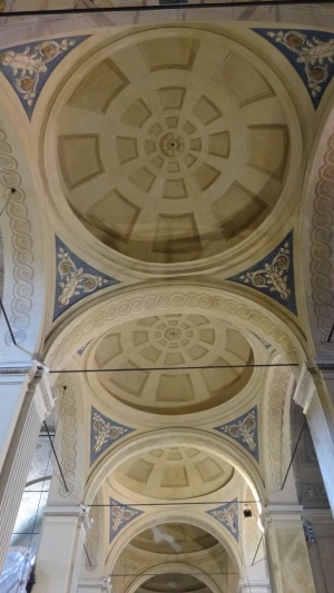 Il fondo blu perduto nell’ultimo restauro e utilizzato nei primi anni 20 del XX secolo, è stato ripristinato nelle metope e nei pennacchi.