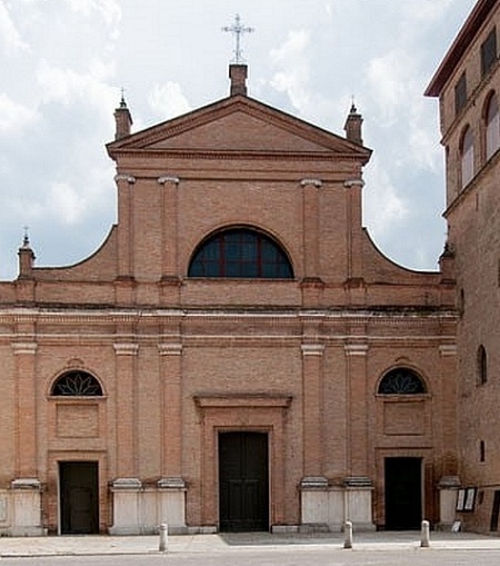 L’attuale aspetto in stile classico, con superfici in cotto a vista, capitelli, cornici e basamenti in travertino, è frutto dell’intervento realizzato nel 1964, su progetto di Carmela Adani (1899-1965). Il rifacimento della facciata della basilica ha comportato l’eliminazione della settecentesca decorazione a chiaroscuro e finto marmo, che ben si armonizzava con le tinte dei palazzi circostanti e con le decorazioni presenti all’interno della chiesa.